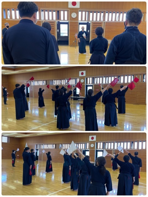 5/22(日)の宝塚市民剣道大会に向けて審判をしてくださる先生方を対象に新型コロナウイルス感染症が収束するまでの暫定的な試合審判法(全日本剣道連盟)を審判員と試合者が共に理解する主な事項について学びました。