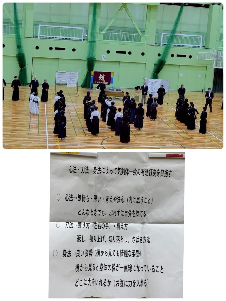 教士八段 上野先生のご講話に始まり、木刀稽古や基本稽古では、お辞儀・足捌き・竹刀での素振り・面打ち・面タオルの巻き方などを改めて学び、再認識することができました。