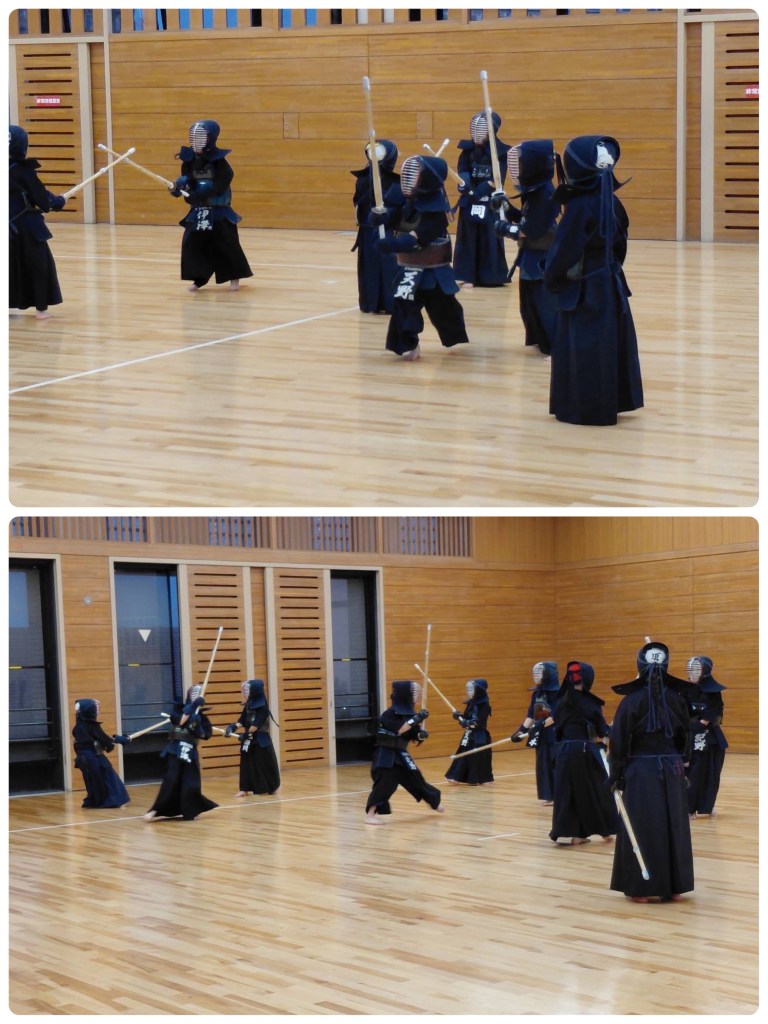 中学生、高学年、低学年は縦稽古を前半行い、後半はグループ毎に分かれ基本打ちから試合に向けての練習です。